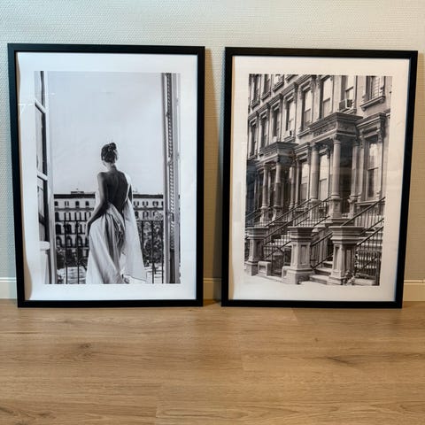 Mamma selger et et pent blomster bilde i svart og gull.