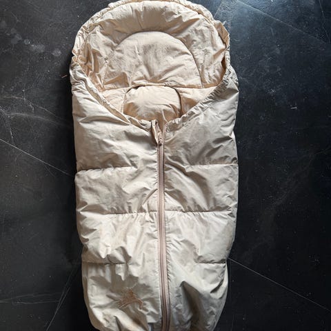 Stokke vognpose i hvit farge. Laget av mykt og isolerende materiale. Passer til både gutter og jenter. Et par flekker (prikker) har kommet her og der og går ikke vekk i vask. Vognposen er vasket og kommer fra et røyk- og dyrefritt hjem