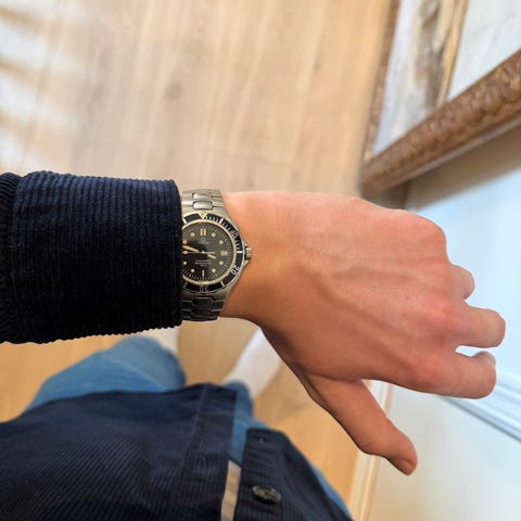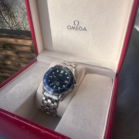 Omega Seamaster herreklokke med blå urskive og stål lenke.