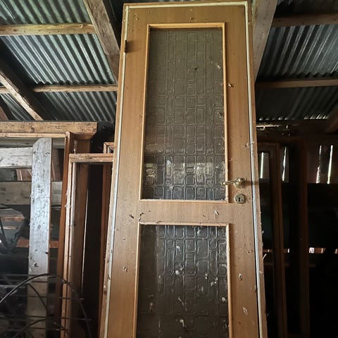 Ukjent merke tre dør med flere glasspaneler i ulike størrelser. Døren har en kombinasjon av tre og glass, med metallbeslag for lås og hengsler. Egnet for innvendig eller utvendig bruk, avhengig av installasjon. Fargen er naturlig tre, og døren har et rektangulært design med horisontale og vertikale inndelinger.