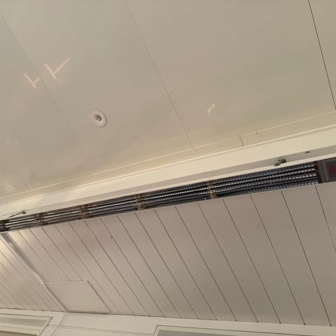 Elektrisk varmeovn med hvit overflate, utstyrt med termostat og justerbar effekt for individuell temperaturkontroll. Passer til oppvarming av mindre rom eller områder. I veldig god stand
