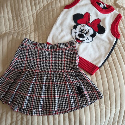 Liten klespakke med Minnie Mus trykk, ene genseren er Mikke mus men (str. 110). Se bilder for detaljer/info.