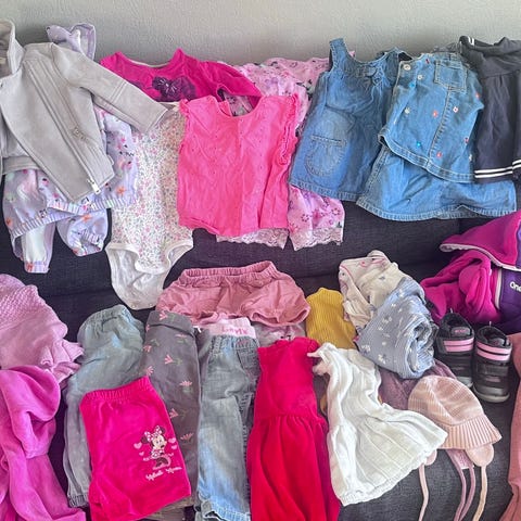 Fine bukser og gensarar til jente. Høgde 74 cm. Bukser høgd 33 cm. Gensar høgd 30 cm, erme 26 cm.