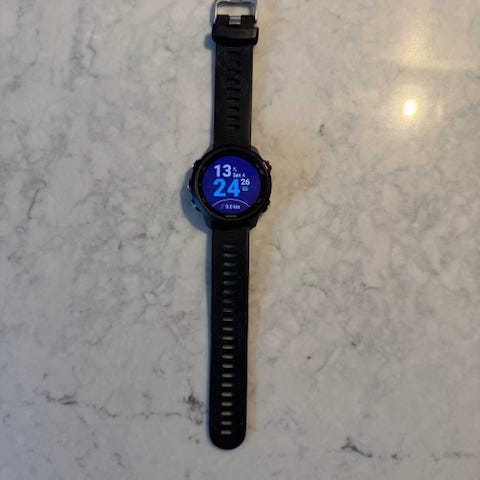 Selger en brukt Garmin 245 music. Det følger med grønn, sort og orange reimer