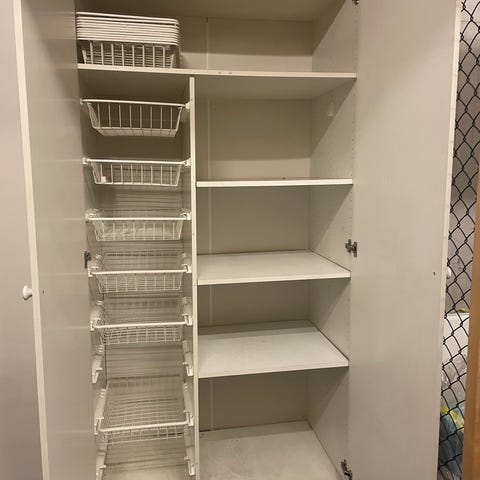 Skapet er tomt inni, har knotter man kan legge hylleplate på.