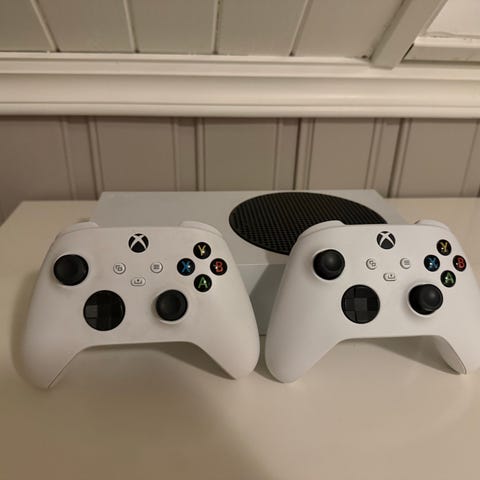 Selge en Xbox s med 2 kontroller og et headsett.