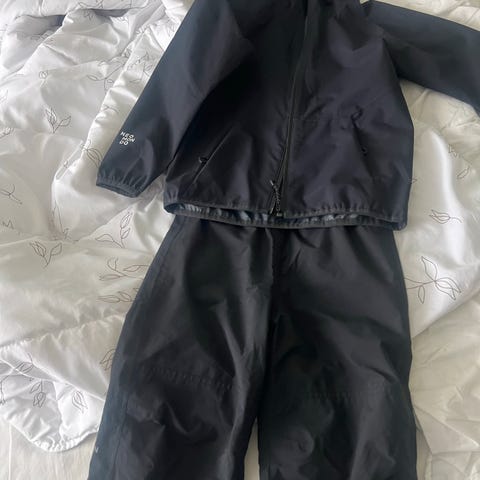 Skallsett/regntøy fra H&M, str. 128 på jakke og 122/128 på utebukse. Kjøpt brukt, men nesten ikke vært brukt her. Jakka trenger en vask, så mulig flekkene går av. Jakka har fleecefór rygg/mage/hette.
