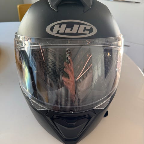 HJC MC1 motorsykkelhjelm i svart farge, størrelse 56. Hjelmen er utstyrt med visir og har ECE R 22-05 sertifisering. Den har polstret innside for komfort og sikkerhet. Aldri krasjet, men godt brukt i ca 3 år.
