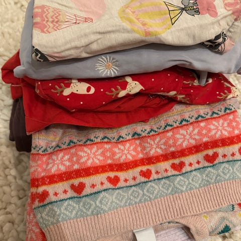 Klespakke til jente 2 år: strikket kjole, genserjakke med glidelås, hvit cardigan, rutete bukse, bomullssett i turkis farge. Selges samlet.