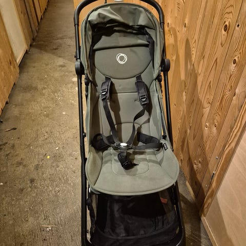 Bugaboo Butterfly reisevogn i grønn farge. Barnevognen har justerbart sete med sele og solskjerm. Ramme i svart materiale.
