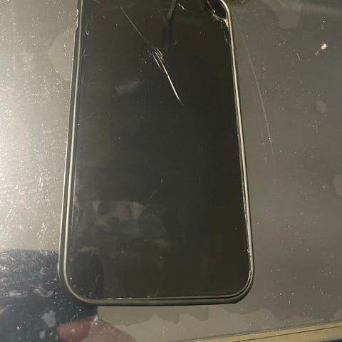 Apple iPhone 12 mobiltelefon med 64 GB lagringskapasitet i svart farge. Enheten har skjerm med flere apper installert, og viser bruksspor på kantene.