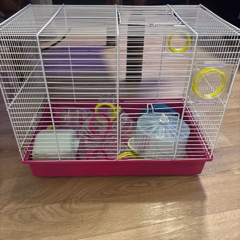 To bur for smågnagere med tilbehør inkludert flere plastboller, treleker, løpehjul, og diverse annet utstyr. Burene har metallgitter og plastbunn, egnet for små kjæledyr som hamstere.
