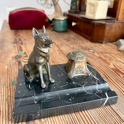 Antik penneholder i bronse/kobberlegering. Formet som en sittende hund.. ca 1900 t. Usignert. Hul/støpt. Vekt 43,74 gr. Fin patina. Ønsker bud