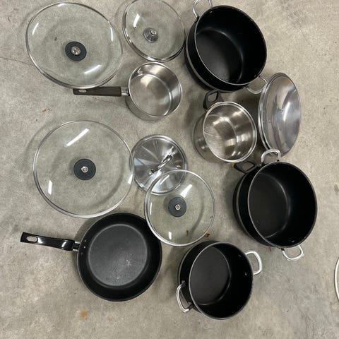 Settet inkluderer to gryter med håndtak og en kasserolle med langt håndtak.