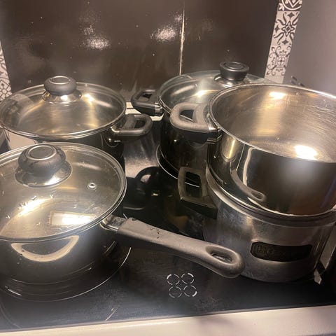 Grytesett i rustfritt stål bestående av tre deler med tilhørende lokk.