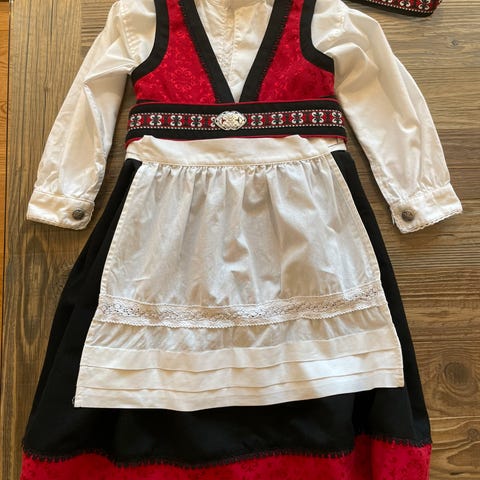 Pent brukt bunad / festdrakt av 60 % ull og 40 % polyester. Strømpebukse og skjorte medfølger. Liten flekk på skjorten (se bilde)