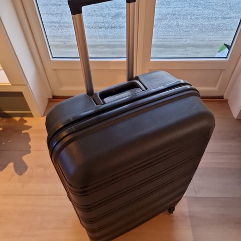 Koffert med fire doble og stillegående hjul. Hjulene har 360 grader rotasjon. Kofferten er laget av slitesterkt materiale og har solid glidelås med stor glider.