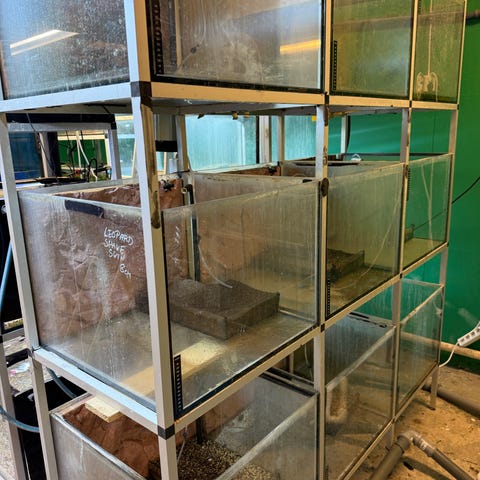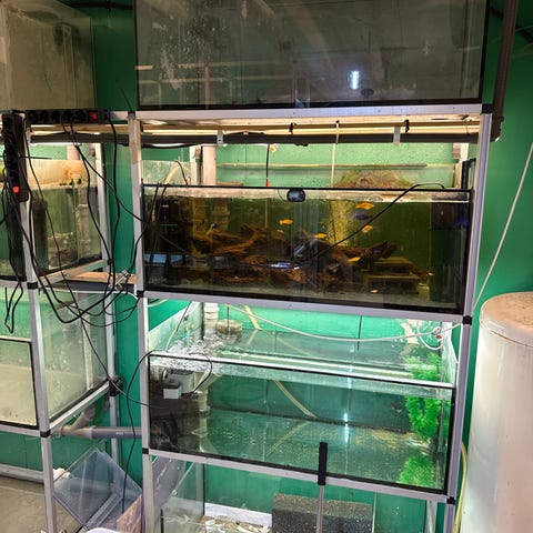Reol med 4 stk 222l som igjen er delt i 2. Selges med innvendig svampfilter som kan drives med luft eller pumper. Borret i bakvegg for overløp. Reolmål: L:229cm H:193cm D:45cm
