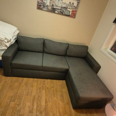 Grå sovesofa selges. God å både sitte og ligge i. Madrass måler 190x140cm, og kan blåses opp for en comfort av en annen verden😁 pumpe medfølger ikke. Utenom noen nupper, trolig etter katten, er sofaen nesten som ny.