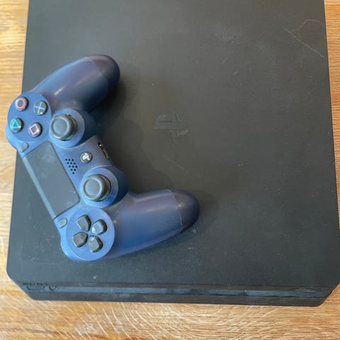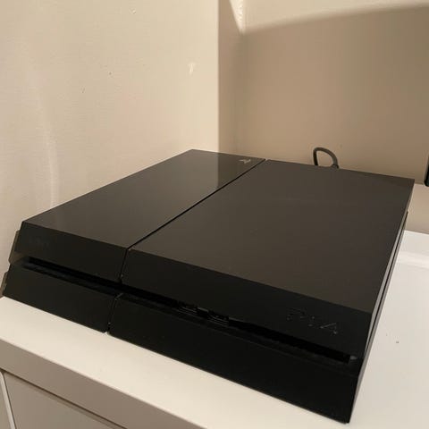Sony Playstation 4 spillkonsoll i svart farge. Konsollen er designet for å spille Playstation 4 spill og har standard funksjoner. 500GB