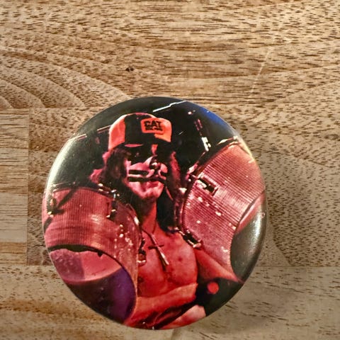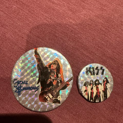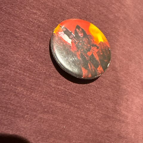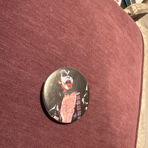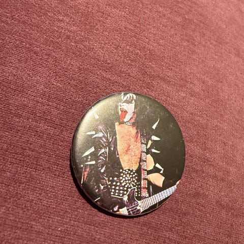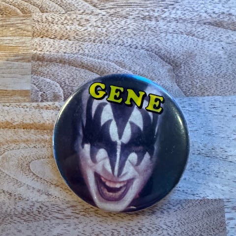 Selger én eldre KISS-button med motiv av Gene Simmons.