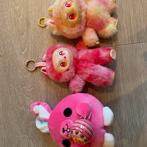Selger 4 uåpnede lignende Labubu dukke med nøkkelring. Selges fordi vi fikk flere av de samme. Disse er kjøpt i norsk butikk. Det er 3 av den hvite og 1 av den rosa. Selges for 150 kr stykket