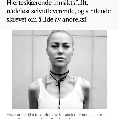 Ærlig, nådeløs og usentimental skildring fra anoreksiens innside. Skrevet over tre år, gjennom en langsom tilfriskning, av en forfatter med den unike kombinasjonen pasient, journalist og sykepleier. Hvordan oppleves norsk psykiatri for en pasient med anoreksi og tvangslidelser? Hvilke kamper utspiller seg i et menneske som vil gjøre det slutt med en sykdom som har vært både livline og livsfarlig siden hun var barn? Hva skal til for å gi slipp? Hvor mye betyr egentlig vekt?