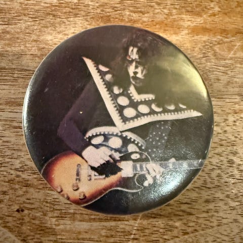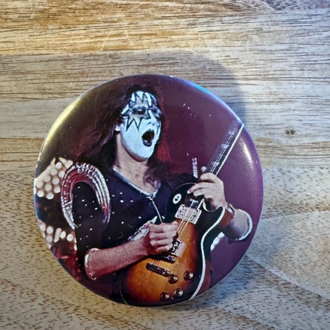 Eldre KISS-button med motiv av Ace Frehley (Spaceman).
