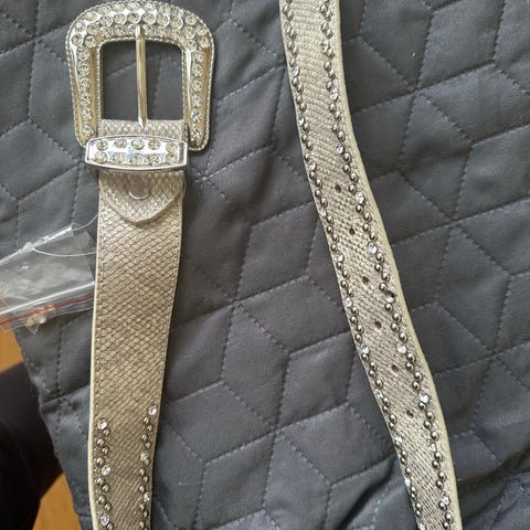 Tekstile belte i grå materiale med rund gullfarget spenne. Beltet har flere hull for justering av størrelse. Egnet for damebruk.
