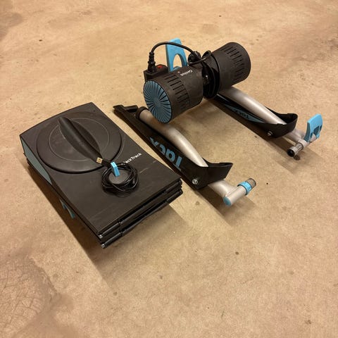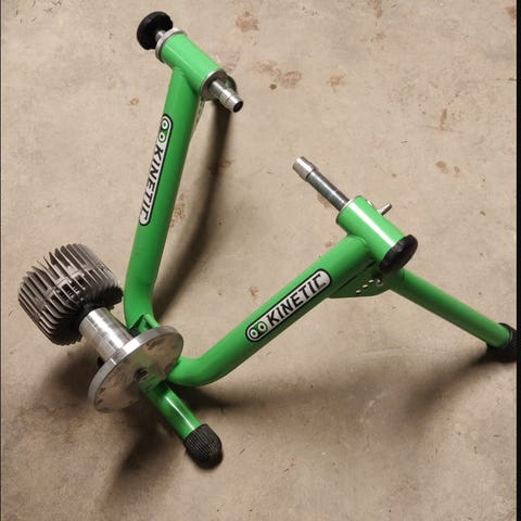Sykkelrulle brukt på racer til vintertrening. Denne har powerfluid så du trenger ikke justere på vrider, bare gir et gir eller flere tyngre så får du mer motstand. Høyere fart gir mer motstand.