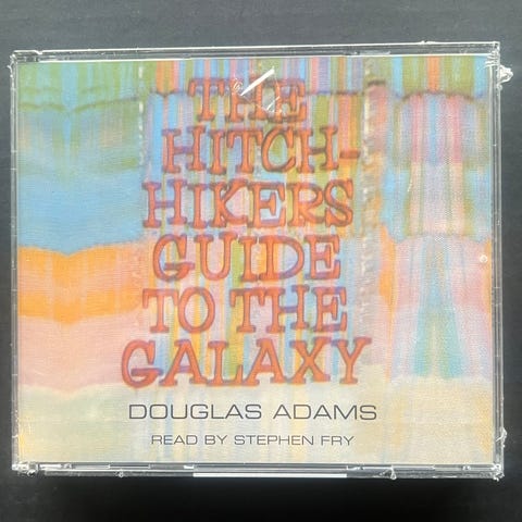 Douglas Adams The Hitchhiker's Guide to the Galaxy CD lydbok. Inneholder flere CD-plater med lydopptak av boken. Utgitt av BBC Audio.