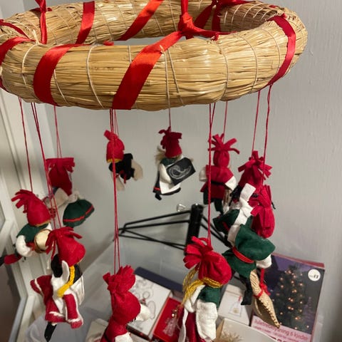 Figuren er 38 cm høy, laget i tre, og har tradisjonelle julefarger som mørk blå og rød.