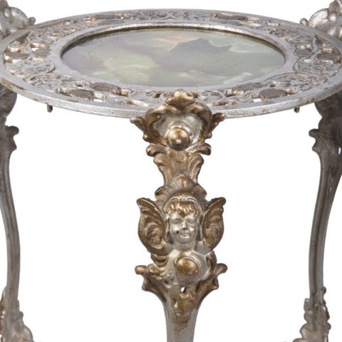 Vakkert paraplystativ i støpejern, muligens antikk. Har preget et produksjonsnummer på undersiden. Sølvmalingen er ikke original. Har nok vært svart i utgangspunktet. Målet 50/25 cm.