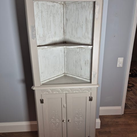 Sjarmerende 100 år gammelt hjørneskap,. Veldig rommelig med fire hyller pluss åpent rom på midten