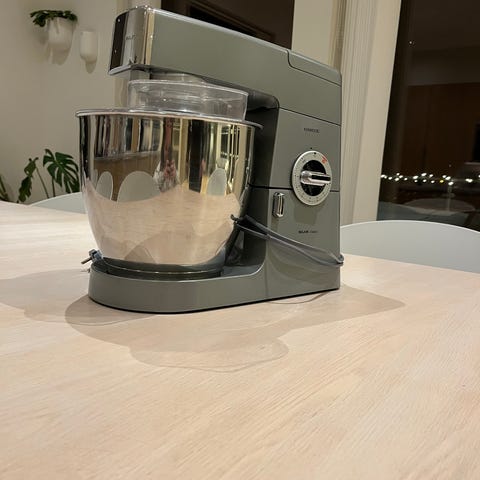 En god kjøkkenmaskin i fin stand, men den mangler K-spade. Den bør være enkel å få kjøpt enten brukt eller på kokken og bakeren.