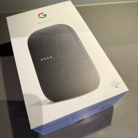 Google Nest Mini smart høyttaler i grå farge. En kompakt enhet designet for stemmestyring og trådløs musikkavspilling.