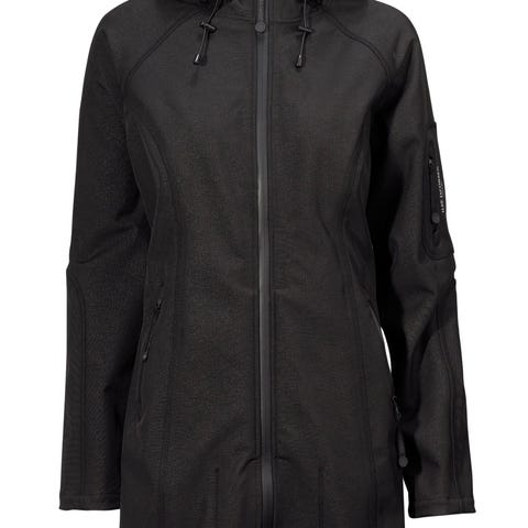 Beveg deg fritt i denne softshell-regnfrakken, laget av pustende og elastisk materiale. Den er designet med en flatterende, feminin form, har raglanermer, en lett innsvinget midje og en splitt bak med knappelukking for bevegelsesfrihet. En