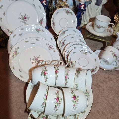 Dette er et dekorativt og tidløst servise som ikke produseres lenger – perfekt for samlere, klassisk interiør eller shabby chic-stil.