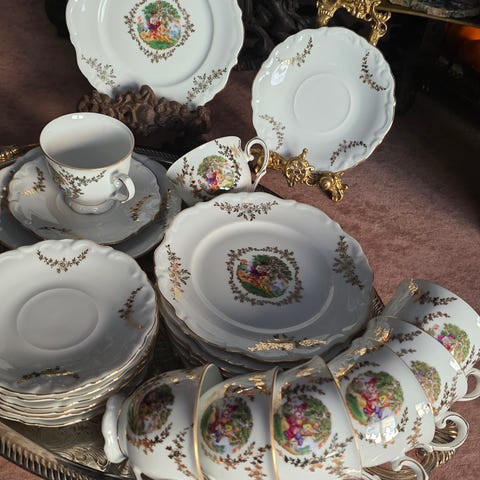 Perlemorsglasur med vakre klassiske motiv og gullkant. Porselen av høy kvalitet produsert i Bayern, Tyskland.