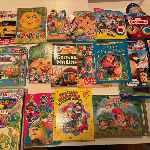 Barnebokserie inkludert tre bøker med fargerike illustrasjoner. Bøkene er skrevet på russisk og passer for barn.