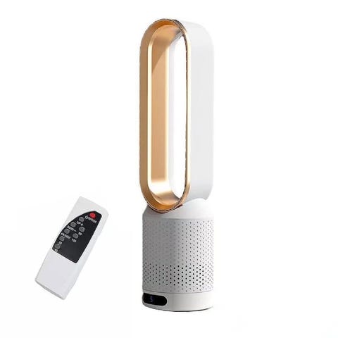 Varm og kaldt luftavfifte i svart og hvitt med kontrollpanel på toppen. Designet for å redusere fuktighet, varme og kulde i innemiljøer. Utstyrt med strømkabel for tilkobling til strømnettet. Oppvarming og avkjøling, varen er fra Clas Ohlson.
