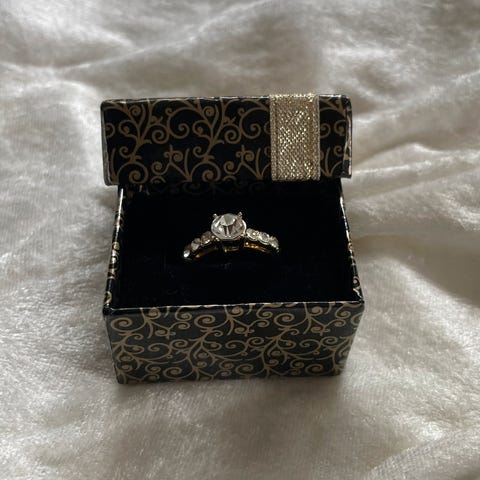 Selges retro robust ring i ukjent materiale med stor stein. Cocktail-ringen.
