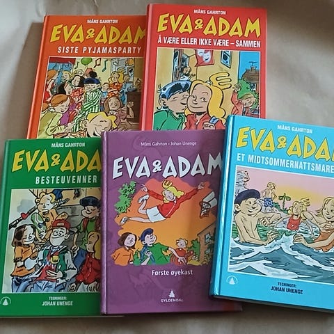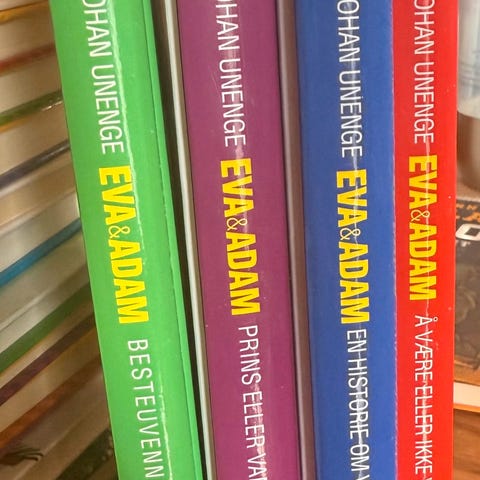 Tre av ungdomsbøkene i serien Eva og Adam fra bokklubben: