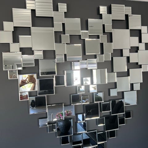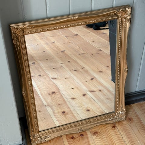 Stort speil 123 cm x 123 cm m/ramme. Speilet 89 cm x 89 cm. Liten skade ca. 5 cm, nederst i høyre hjørne, se bilde 4. Veldig fint og robust speil som gjør rommet Ny pris på på tilsvarende speil ca. 4300 kr