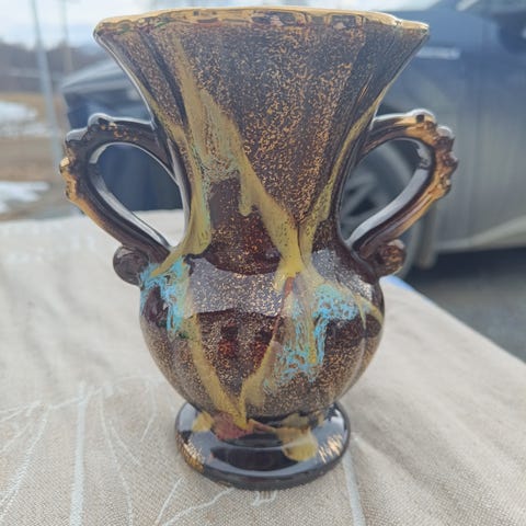 vase med keramisk materiale. Dekorert med et enkelt, mørkt glasurdesign. Egnet som dekorativ gjenstand.