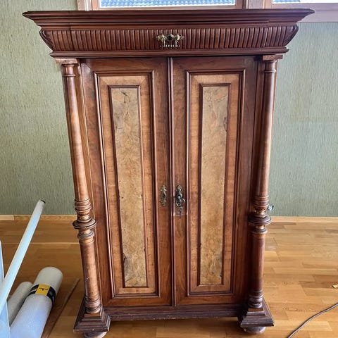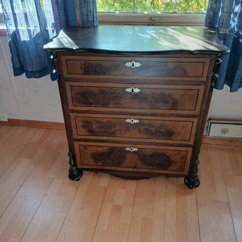 Antikk hvitt skap/skjenk med dekorative utskjæringer og detaljer. Skapet har tre dører med håndtak og dekorative elementer, den ene er ikke mulig å låse, de to andre kan låses med medfølgende nøkkel. Skapet er arvet fra min farmors hus og malt. Trenger litt omsorg og kjærlighet, men har sjarm og potensiale. Hyller inni to av skapene, skuffer og hyller i det tredje. Selges for 1000,-/høystbydende. Hentes på Justvik, Kristiansand