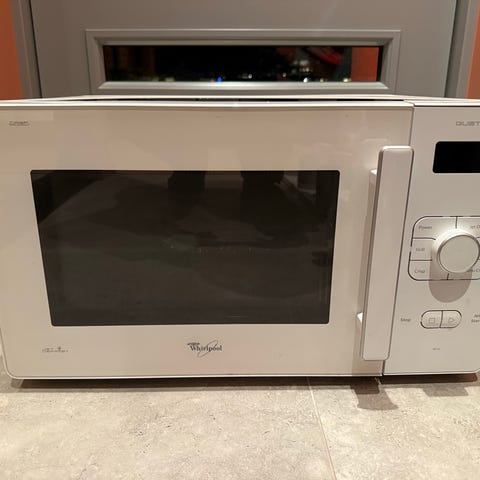 Whirlpool mikrobølgeovn i hvit farge. Utstyrt med manuelle kontrollknapper for innstilling av tid og effekt. Inneholder roterende tallerken for jevn oppvarming av mat. Passer til oppvarming og tining av matvarer.