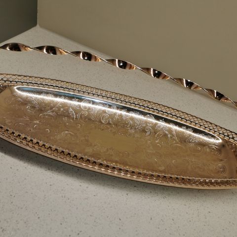 IKEA serveringsfat i metall 52x 38 cm. Fatet har et dekorativt mønster langs kanten og en lys farge.