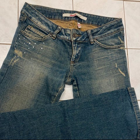 Selger en original Miss Me-bukse i ekte Y2K-style – denne er en sjelden modell med detaljerte baklommer, bling, broderi og alt du vil ha fra en ikonisk 2000-talls jeans. Lavt liv og bootcut passform som gir den klassiske silhuetten.