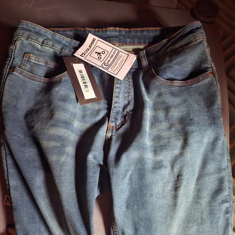Rokker Revolution lady Denim jeans i størrelse W32 L34. Mørk denimfarge med klassisk fem-lomme design. Laget av slitesterkt materiale egnet for mc-kjøring.